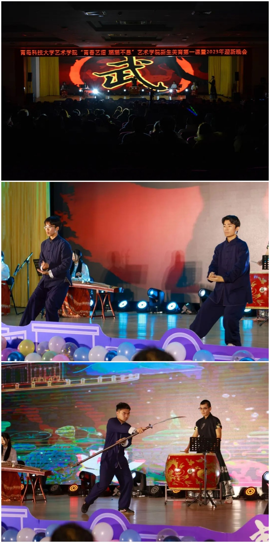 中国有上下五千年的历史,武术和器乐是中华文化中亮丽的瑰宝。中华武术,享誉世界;中国器乐,穿越千年。让我们一起“武”动青春,弘扬青春梦想。开场表演点燃了全场气氛,也正式拉开了2023年迎新晚会的序幕。