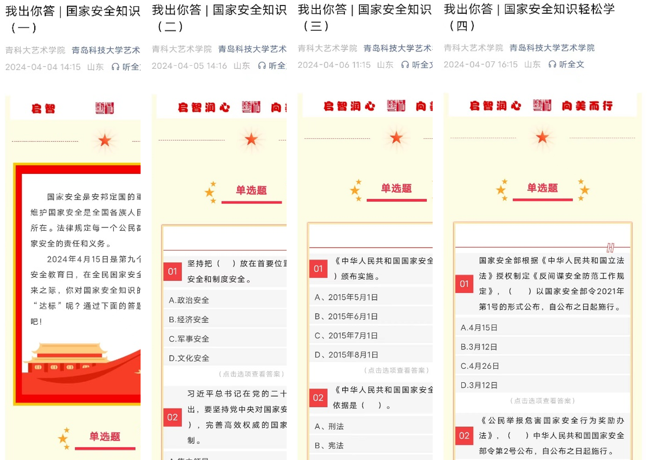 国安标语青年说,知识问答一起学。4月4日-4月7日期间,通过你出我答的形式在微信公众号连续推出四期国家安全知识轻松学。学院将国家安全知识作为进行国家安全教育的重要抓手,通过单选题、多选题、判断题等多种考察模式精心设置每一期的学习内容,确保兼顾学习内容的广度和深度。除此之外,各团支部为进一步加强支部青年学生对于国家安全宣传的认识,发起了“国安标语青年说”特色活动,青年学生在国家安全宣传语思考的过程中,进一步深化自身维护国家安全主人翁角色意识。