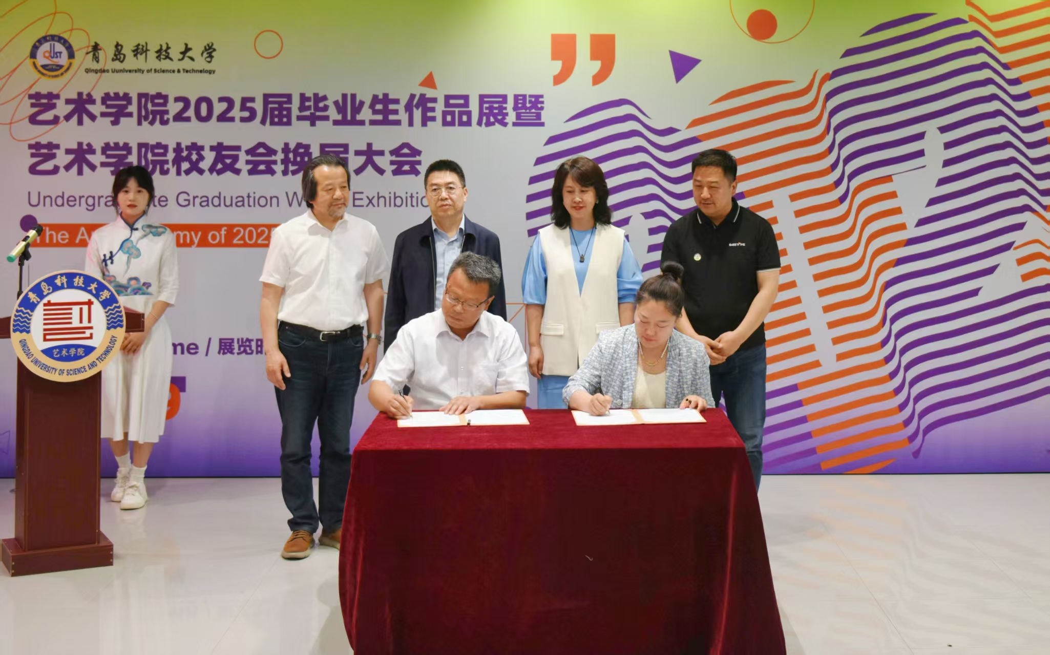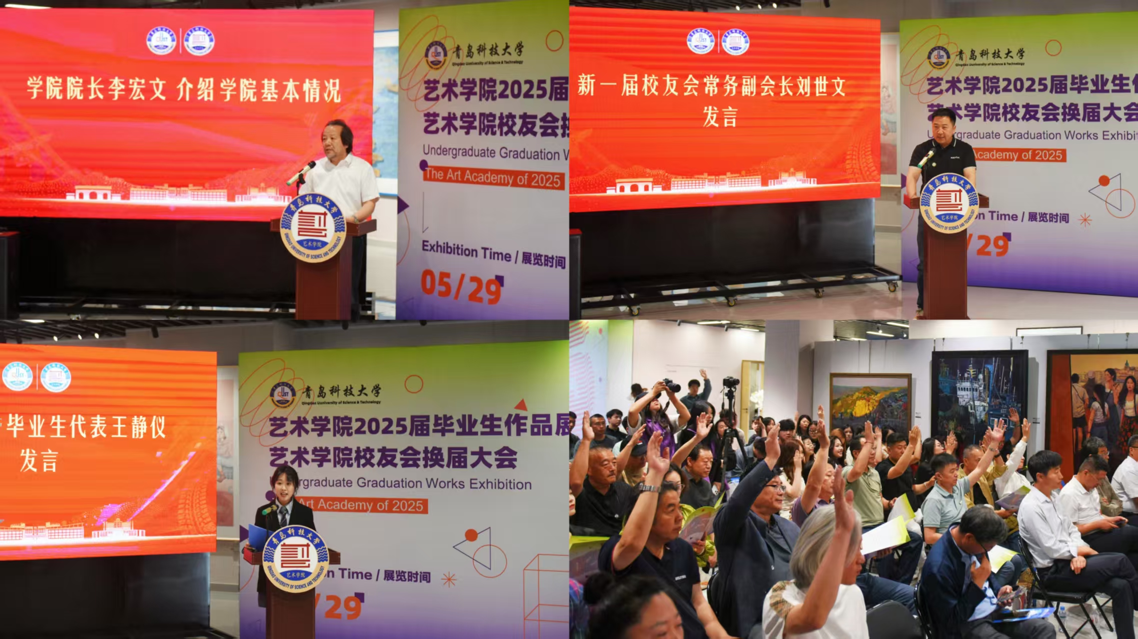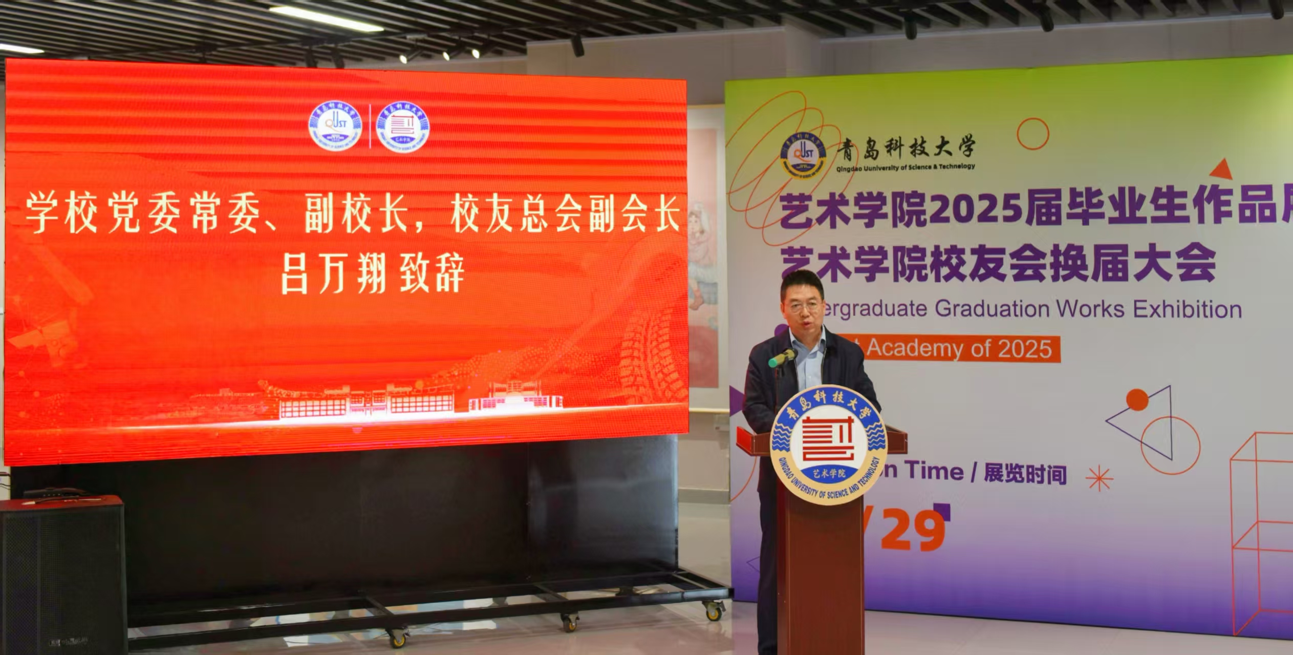 校友换届大会暨2025届毕业生作品展在青岛市李沧区信联天地蔚央艺展中心举行。学校党委常委、副校长吕万翔,原91live