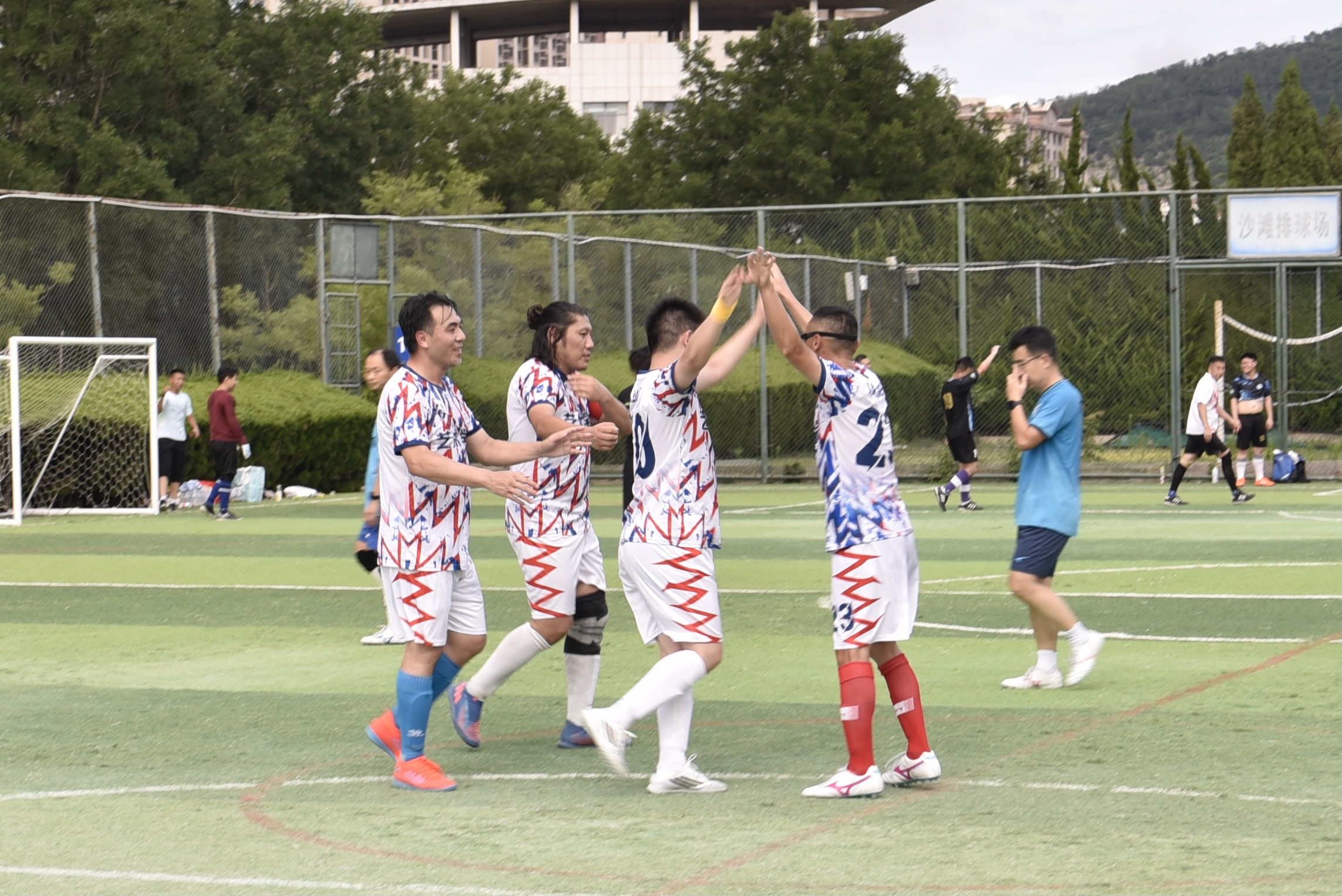足球队以小组第一的成绩挺进半决赛,又以4:1的成绩战胜材料学院进入决赛。在决赛中,老师们在先失一球的不利局面下,克服高温天气,奋勇拼搏、积极跑动,场上场下一条心,相互鼓励支持,通过灵动的跑位、巧妙的传球、精准的射门,接连打进3球,最终以3:1的比分战胜高分子学院,获得比赛冠军。