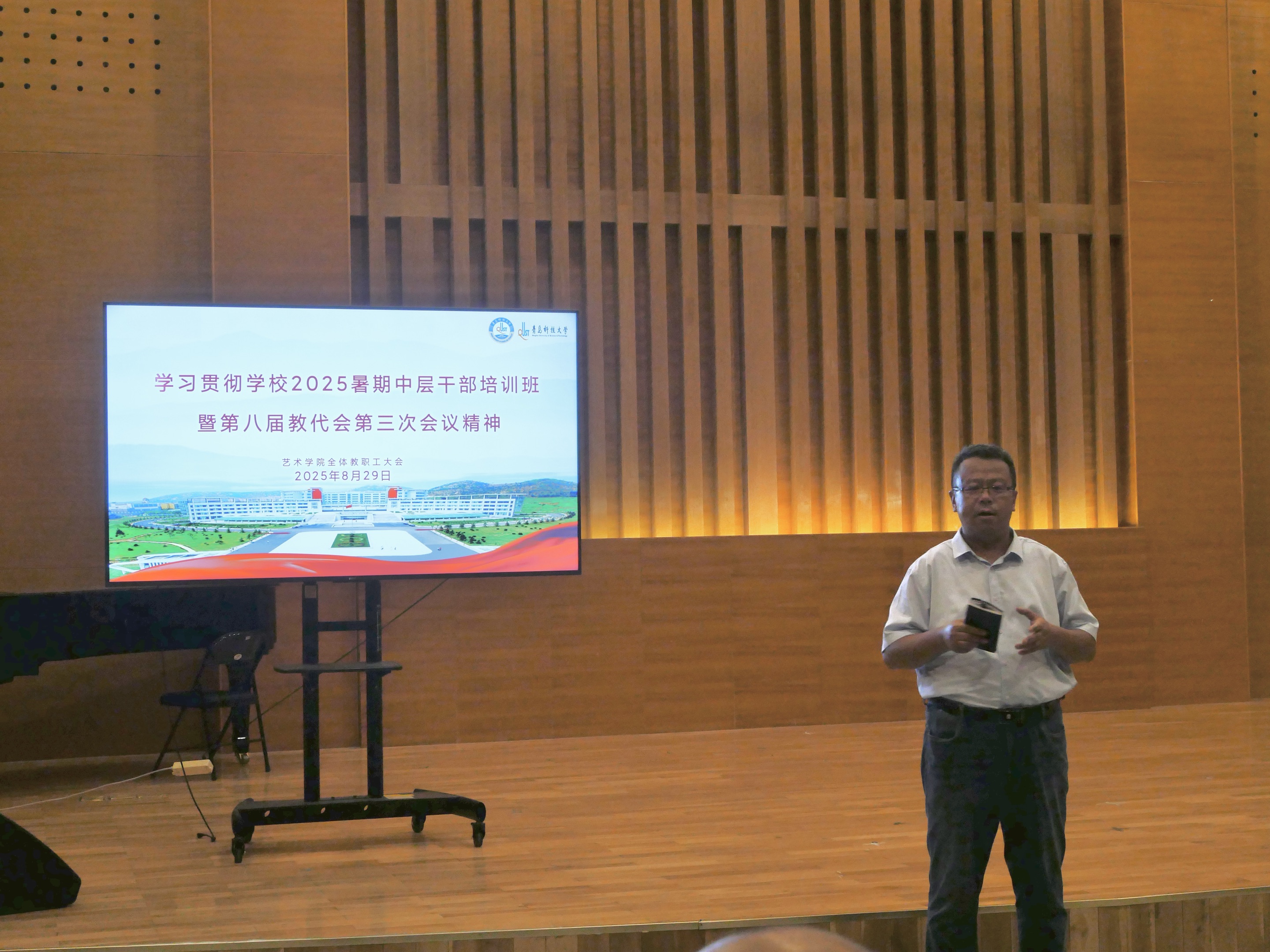 于音乐厅召开教职工大会,学院领导班子、全体教职工参会,会议由党委书记刘庆主持。