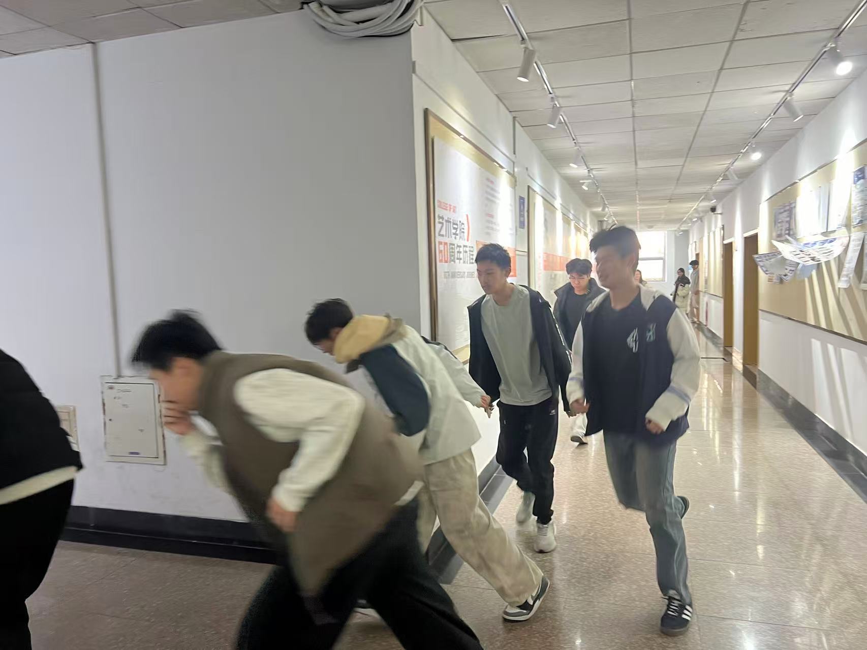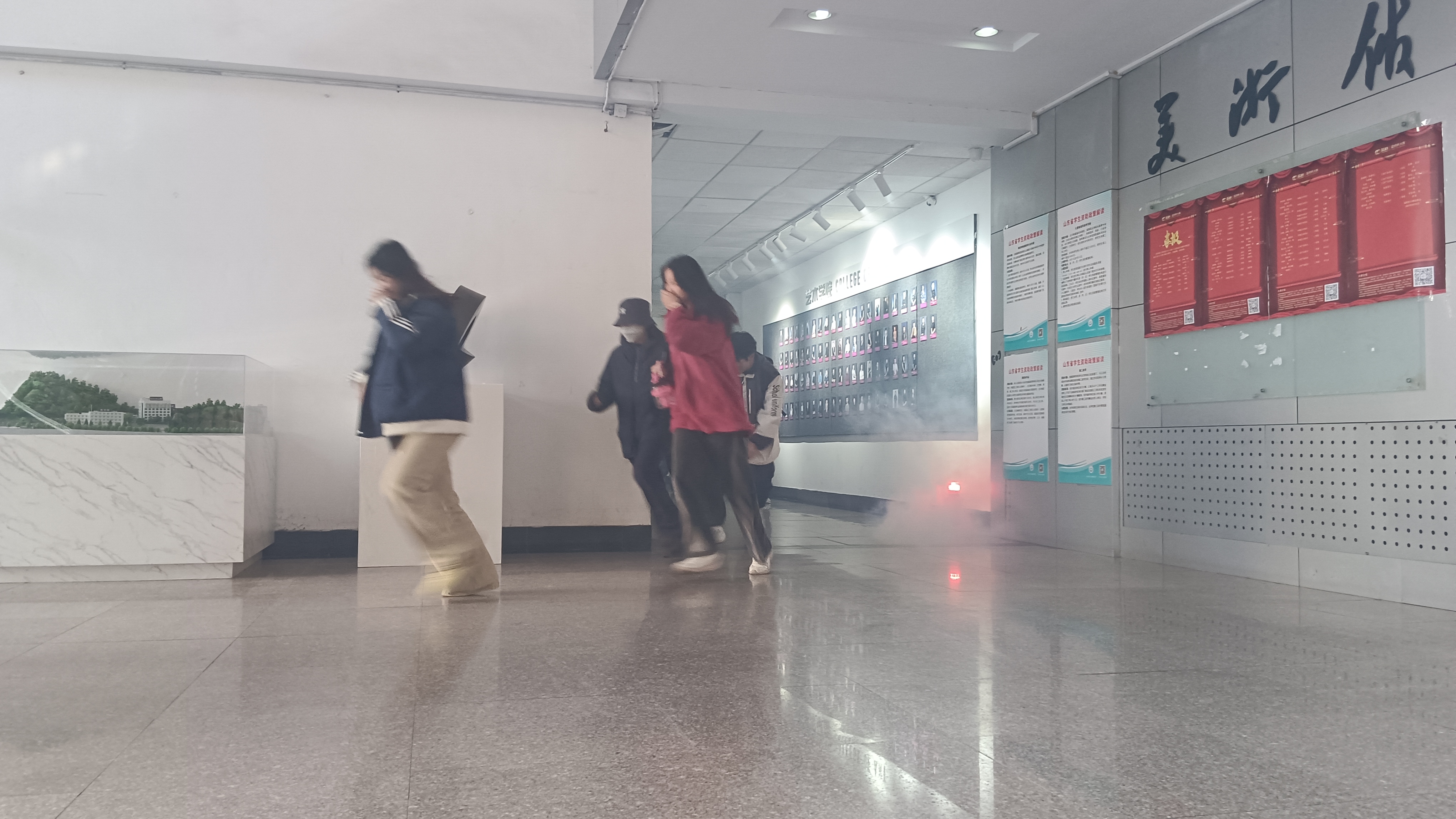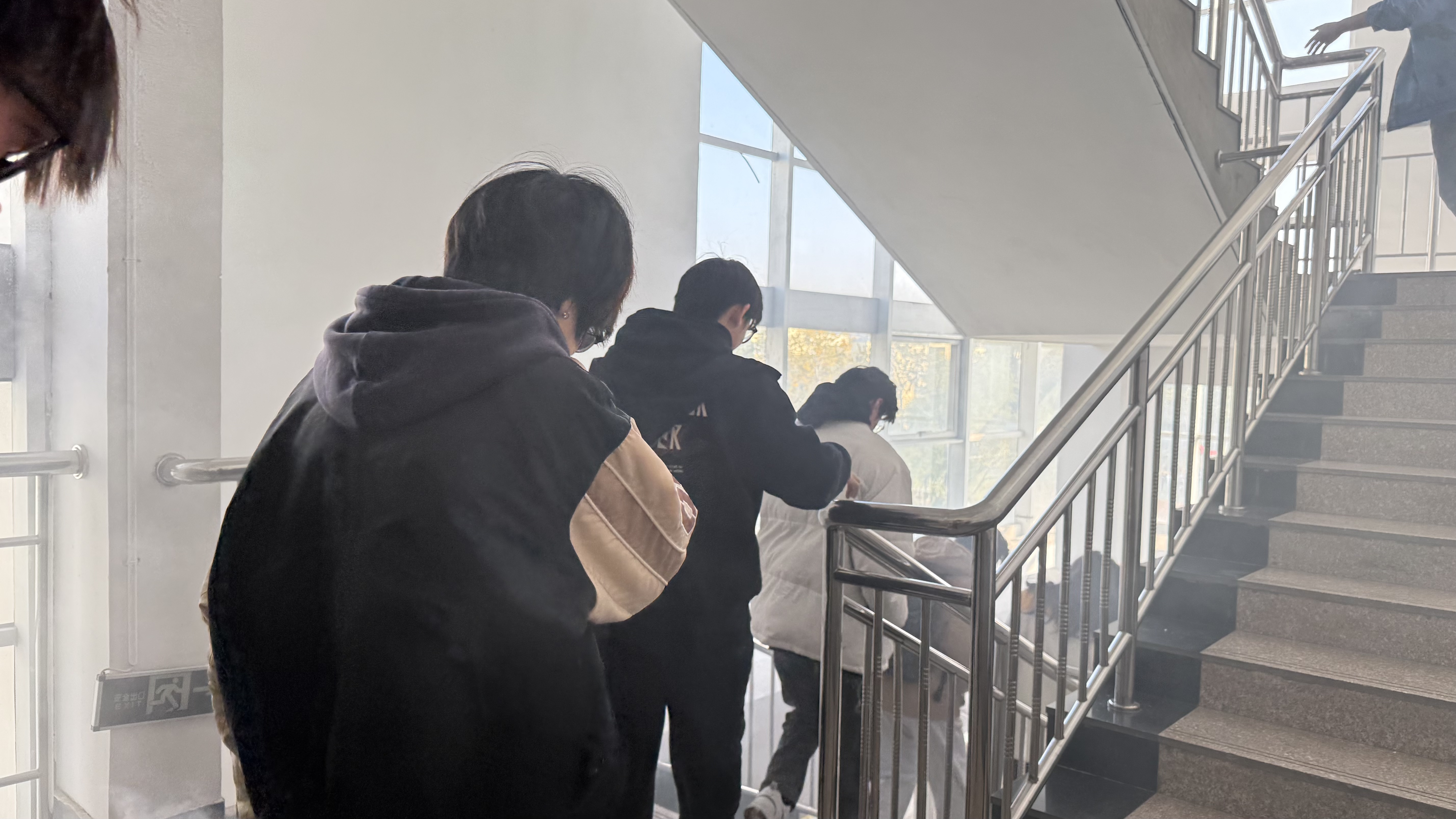 随后,消防疏散演练正式启动。随着模拟火灾警报声响起,辅导员迅速组织学生弯腰低姿、捂住口鼻,按照预设疏散路线快速有序撤离。疏散过程中,工作人员在楼梯转角、安全出口等关键位置引导分流,提醒学生避免拥挤、保持间距。全体师生沉着冷静、配合默契,仅用3分钟便全部安全抵达指定集合区域,完成疏散任务。