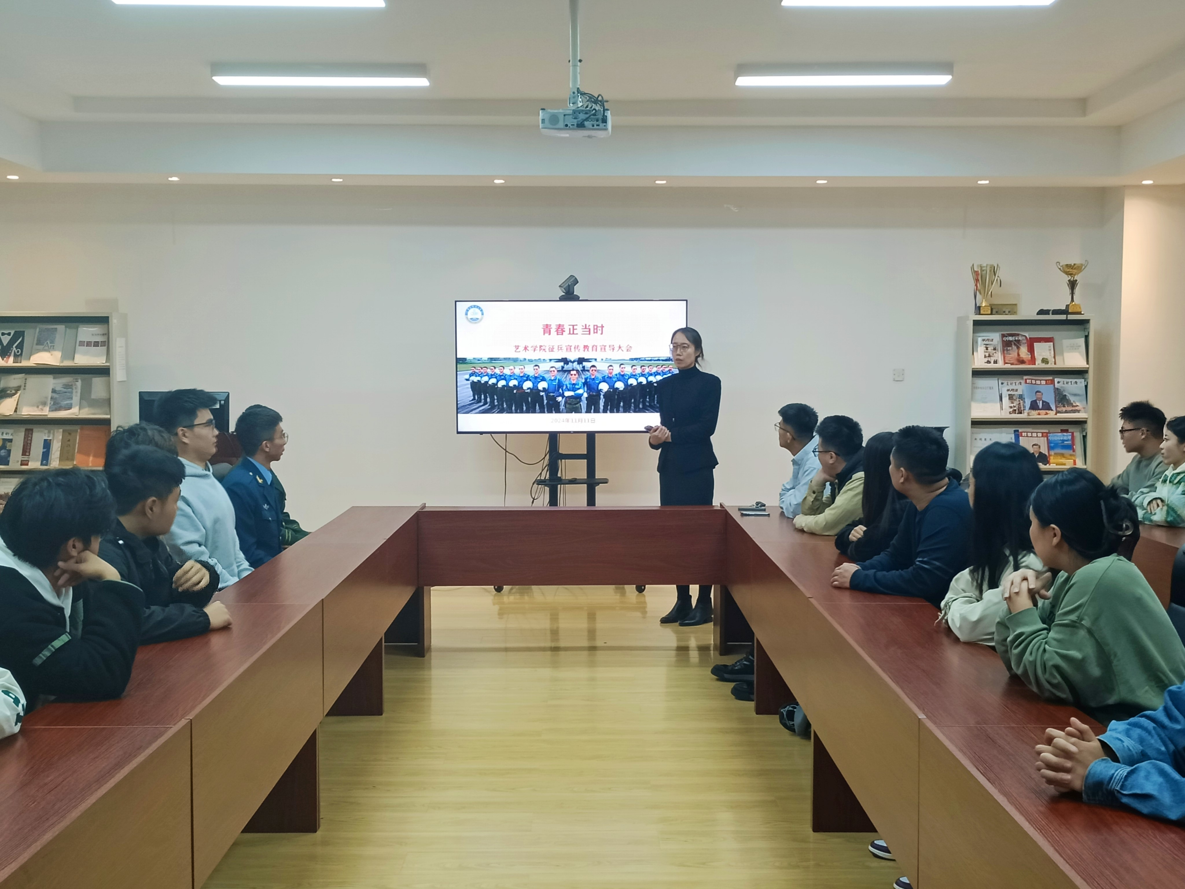 为深入贯彻习近平总书记关于新时代强军思想的重要论述,11月11日,2022级研究生“青春正当时”征兵宣传教育主题班会在213会议室举行,辅导员丁一宁出席班会,学院研究生、退役士兵代表张圣勇、宋鹏宇担任主讲人。