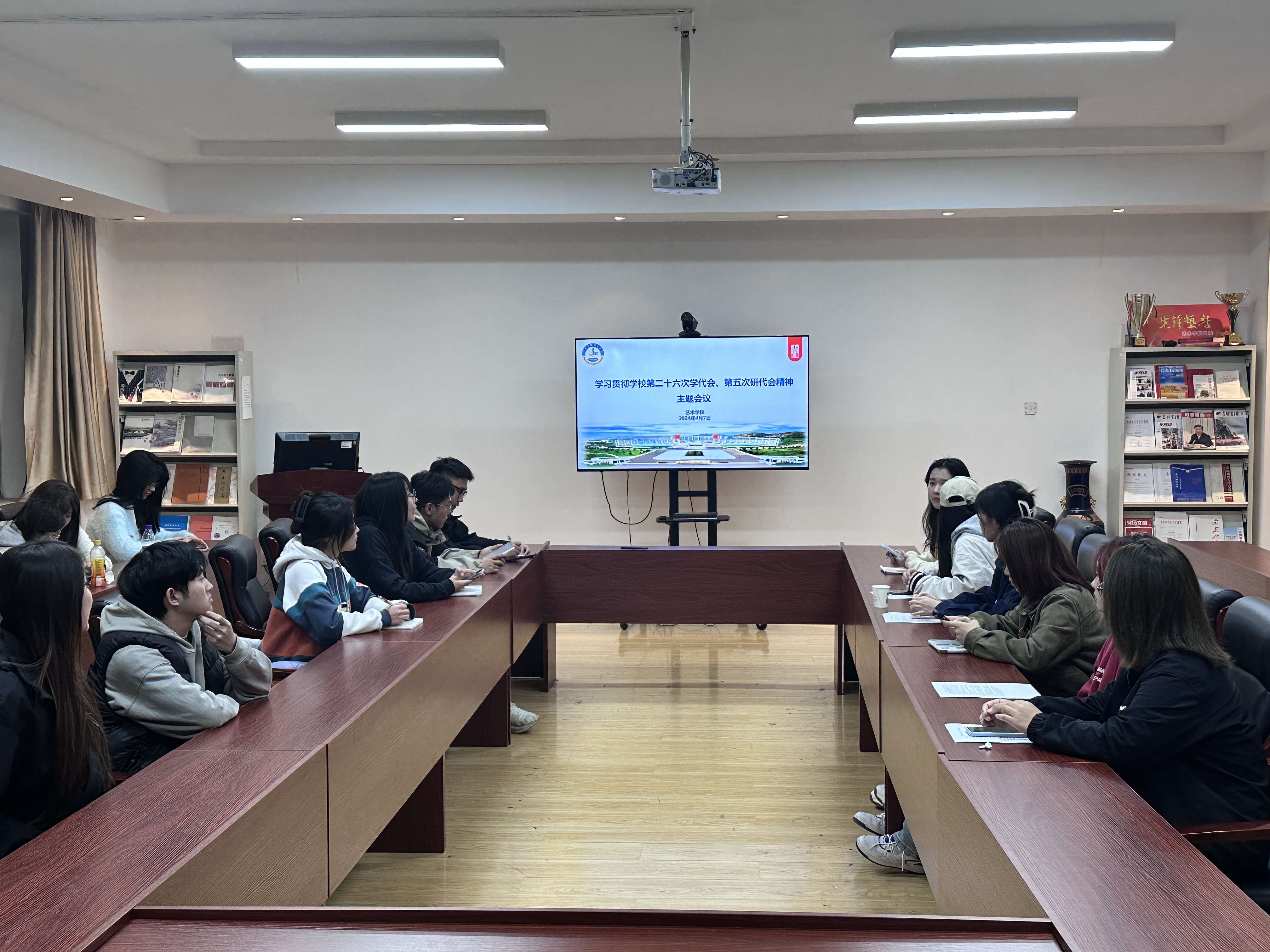 于213会议室召开学习贯彻学校第二十六次学代会、第五次研代会精神主题会议。学院学生会执行主席段景耀、研究生会主席于伊凡及骨干成员参加会议。