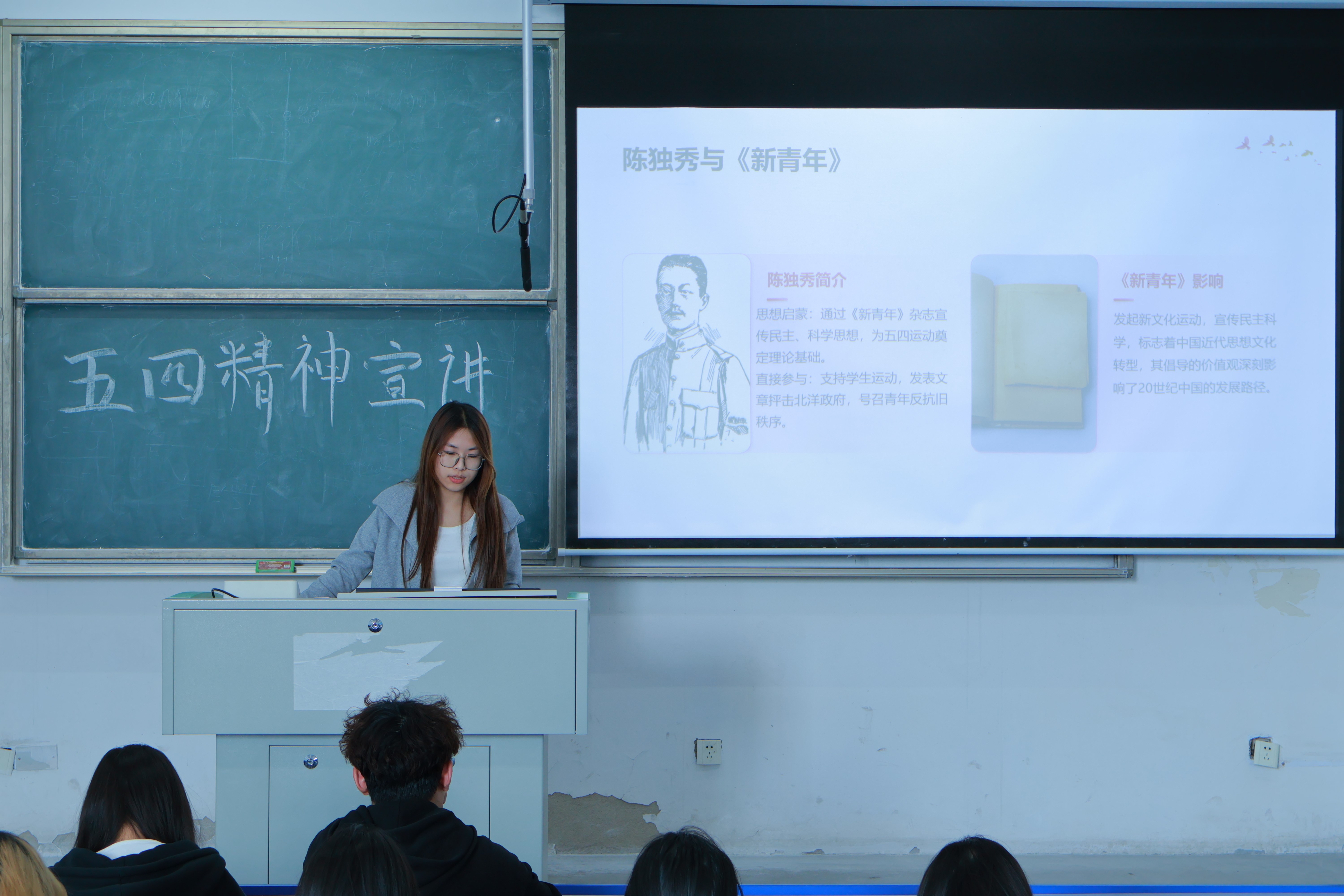 活动以五四运动关键人物与重大事件为主线,通过讲述陈独秀、李大钊等先驱者的革命事迹,重现“火烧赵家楼”“学生游行示威”等历史场景,展现先辈们的爱国热情与奋斗精神。会上,同学们以生动的语言与饱满的情感,还原了五四运动中青年群体挺身而出、捍卫民族尊严的壮丽图景,深刻体会“爱国、进步、民主、科学”的五四精神内核。