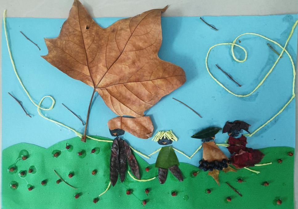 作品说明:这幅作品描绘的是四个不同性格不同年龄的大孩子小孩子们,为首的大孩子正举着一把大伞,为后面的孩子遮住大雨的场景。在雨中,孩子们嬉笑打闹,即使身处暴雨中也大步向前,开心成长。作品的材料主要是树叶和线,大家手拉着手,快乐的奔跑。在成长的道路上,有暴雨,也有鲜果,长长的黄色的线代表着有很多人跟他们一起向前奔跑,组成长长的队伍,右上角的爱心代表着大家都积极向上,团结一心,热情友爱,共同在暴雨和鲜果中成长。