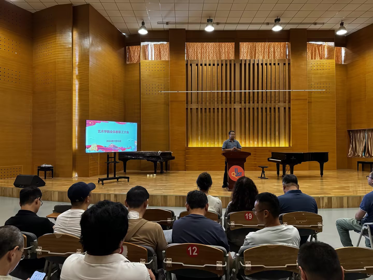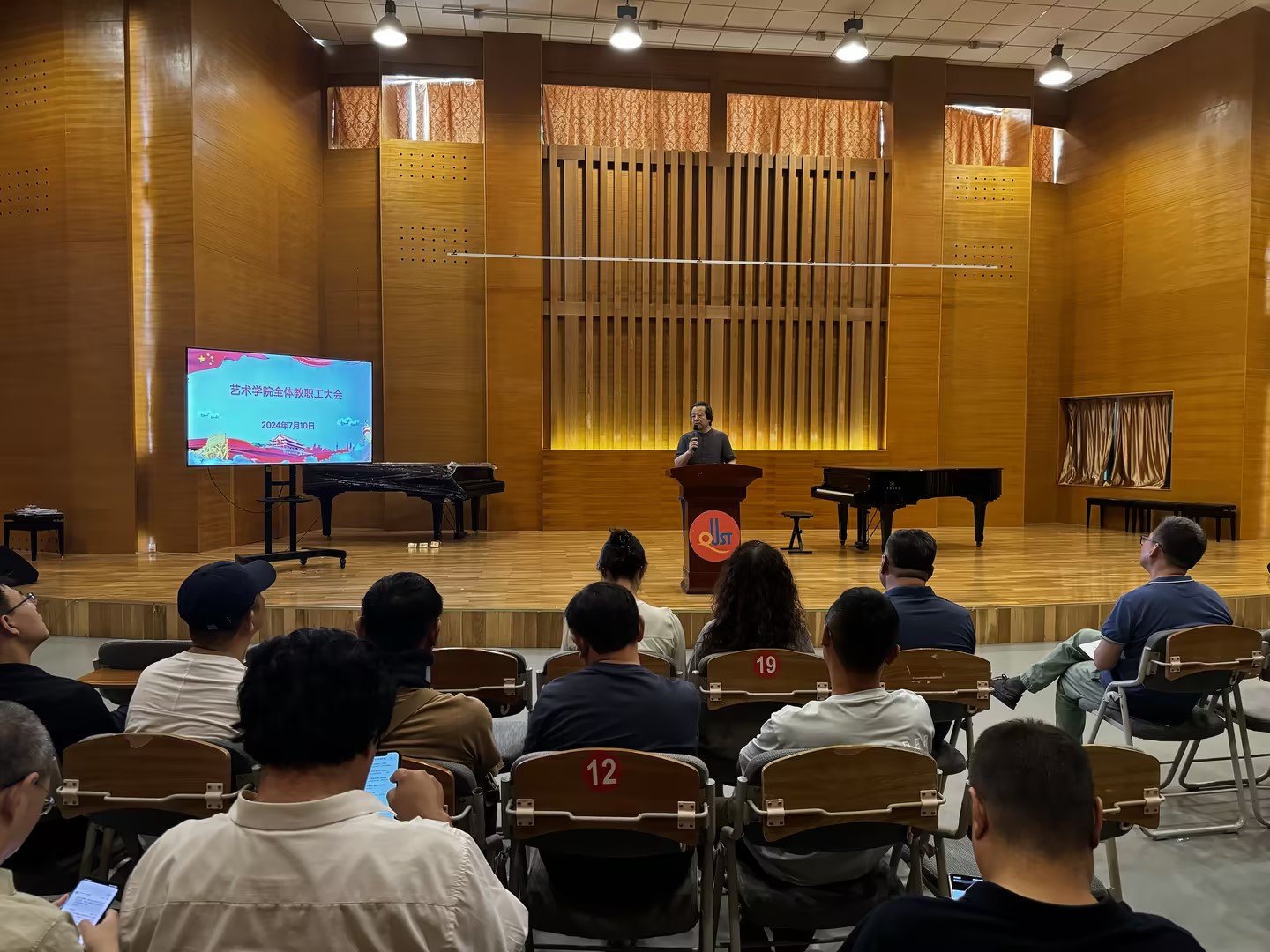 于音乐厅召开全体教职工大会。学院院长李宏文,党委书记刘庆,副处级组织员曲波,副院长兼副书记丁一宁,副院长禹青、勾锐、王虹等学院领导班子成员及全体教职工共同参加会议。会议由刘庆主持。