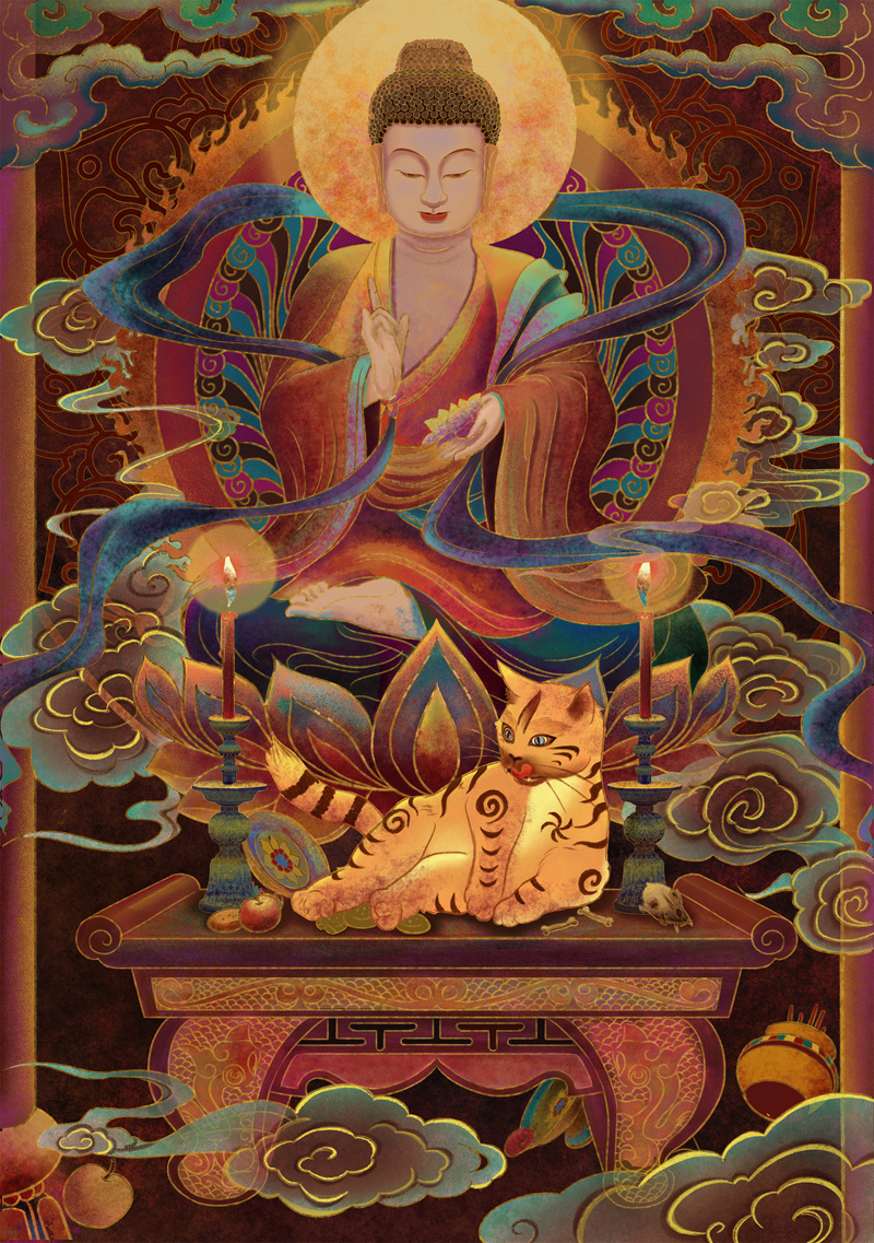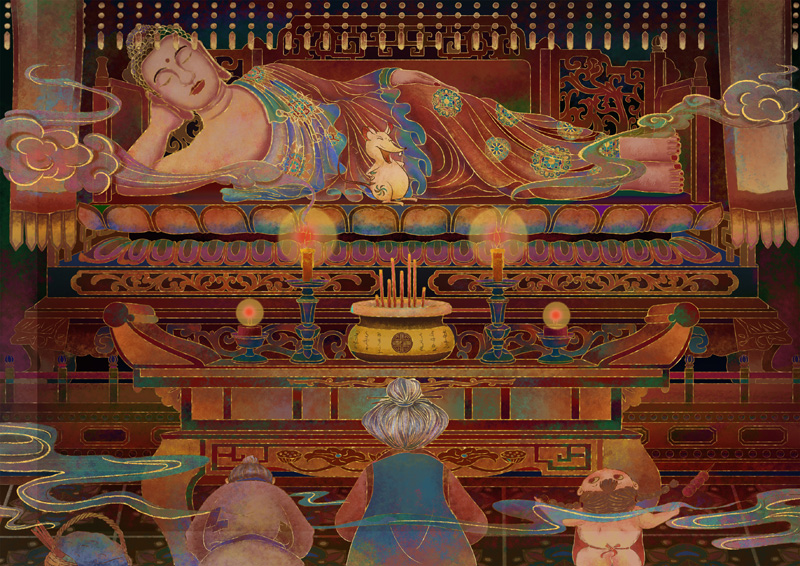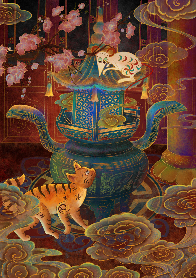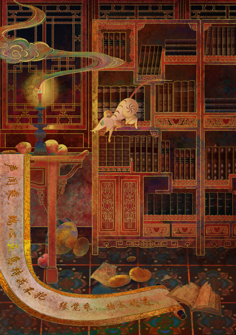 为了完成创作,两位同学到湛山寺调研收集素材,在色调、纹样和场景上获得了很多的灵感。在构图上采用故事绘本形式,以颠沛流离、东奔西穿、狂妄自大、抱头鼠窜和乐极生悲五个关键故事情节进行绘制。线稿阶段反复推敲,加入了大量的寺庙元素、文物和场景,如:佛塔、书架、烛台、佛像、莲花座、香炉、案几、香炉以及寺庙建筑。在猫鼠角色设计上带有中国剪纸纹样风格特征,形象上活灵活现、栩栩如生。五幅作品统一采用朱砂红为主色调,以赫黄、柳绿和湛蓝色等作为辅助色,既渲染了画面氛围,又将五幅独立的作品相统一,画面背景色调较暗突出了偏亮色的主体,也使得画面更加具有空间感。