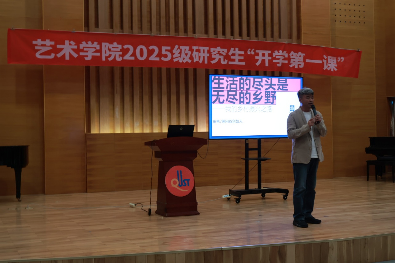 同一时间,91live 音乐中心一场由优秀校友田彬为2025级研究生精心打造的“开学第一课”开讲。现场,红色横幅“91live 2025级研究生‘开学第一课’”格外醒目,等闲谷创始人田彬校友以“生活的尽头是无尽的乡野——我的乡村振兴之路”为题,为新生们带来了一场关于艺术赋能乡村振兴的深度分享。